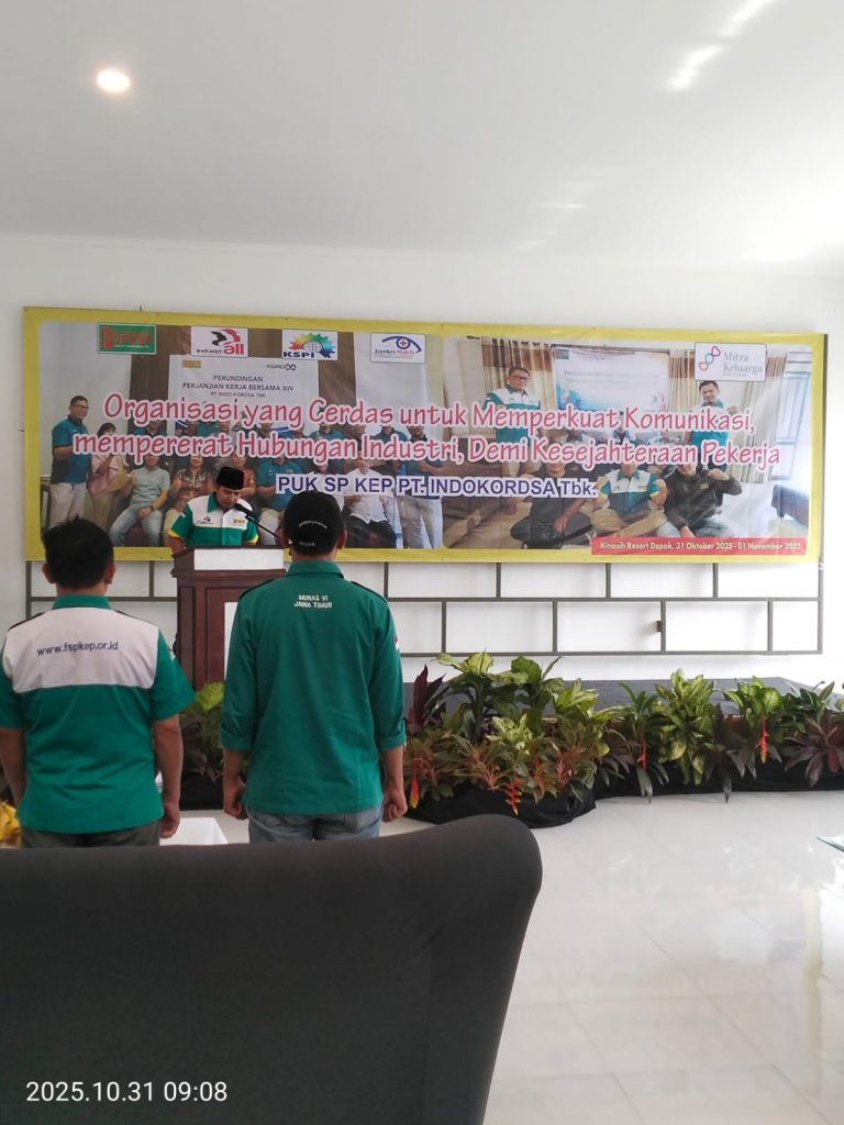 Depok, Fspkep.id | Pimpinan Unit Kerja Serikat Pekerja Kimia Energi Pertambangan Minyak Gas Bumi dan Umum (PUK SP KEP) PT. indokordsa Citeureup melaksanakan pendidikan Organisasi untuk Anggota bertepat di Kinasih Resort Depok pada hari Jumat dan Sabtu, 31 Oktober dan 1 November 2025.