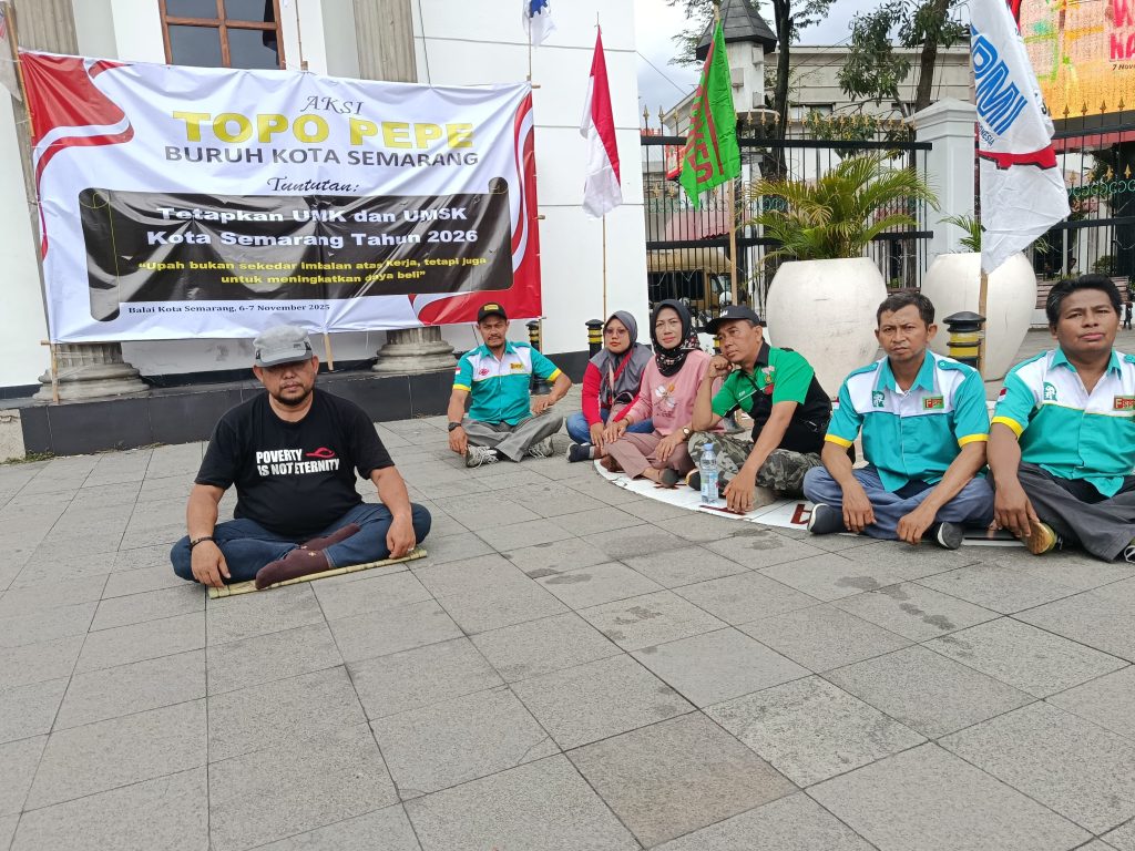 Semarang, Fspkep.id  | Di bawah terik matahari pagi yang mulai menyengat, puluhan buruh dari berbagai pabrik di Kota Semarang berkumpul di depan Balai Kota, Kamis (6/11/2025). Dengan wajah-wajah penuh tekad, mereka mengawal aksi Topo Pepe — sebuah bentuk perjuangan damai yang menggabungkan spiritualitas, keteguhan hati, dan perlawanan terhadap ketidakadilan upah.