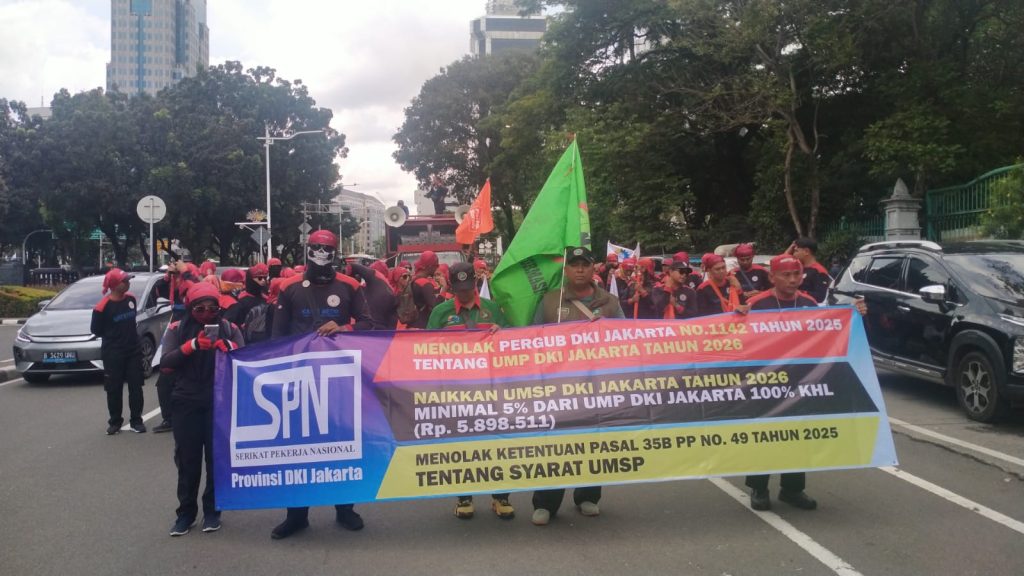 Jakarta, Fspkep.id | Ratusan buruh dari berbagai federasi dan konfederasi serikat pekerja menggelar aksi unjuk rasa menolak penetapan Upah Minimum Provinsi (UMP) DKI Jakarta 2026 di kawasan Patung Kuda, Jakarta Pusat, Senin (29/12/2025). Buruh menuntut agar UMP Jakarta ditetapkan sesuai standar Kebutuhan Hidup Layak (KHL) sebesar Rp 5.898.511.